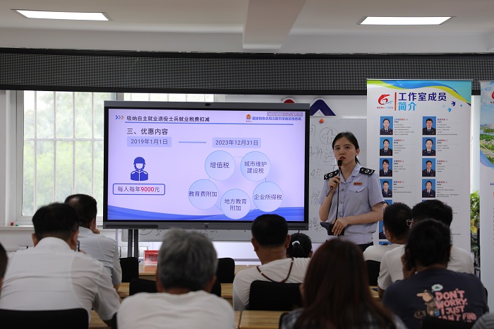 辽宁长安网讯 在“八一”建军节来临之际,沈阳市浑南区税务局聚焦退役军人群体,积极做好“我为纳税人缴费人办实事”暨“便民办税春风行动”,与浑南区退役军人事务局、浑南区人社局联合举办“退役军人个体工商户服务月”活动,在政策辅导、税收优惠等方面为退役军人提供全面讲解,助力退役军人就业创业“整装启新程”。
