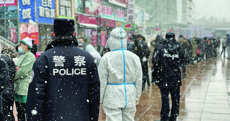 执勤民警和社区工作者加入维持秩序的队伍,在寒风中引导市民参加检测。