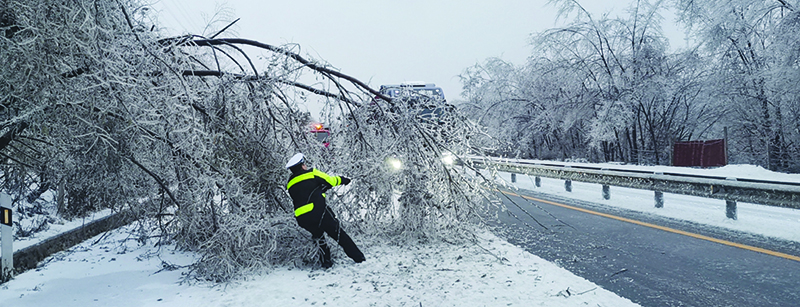 11月8日早,本溪满族自治县公安局交管大队民警在集本线水洞段巡逻疏导交通时,发现路旁树木被积雪压倒。挂着雪的树木将公路遮挡了大半,影响来往车辆通行。为了清理险情,民警迅速上前想将倾倒树木清理掉,但挂着雪的树枝又冷又沉,民警只能拼了命地拉扯树枝,细小的树枝剐到他们的脸上,破碎的冰碴也不停地往下掉,但是他们还是拼尽全力将树木清理挪开,让道路恢复了畅通。
