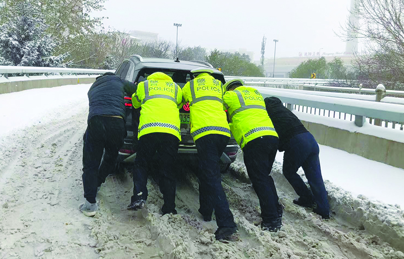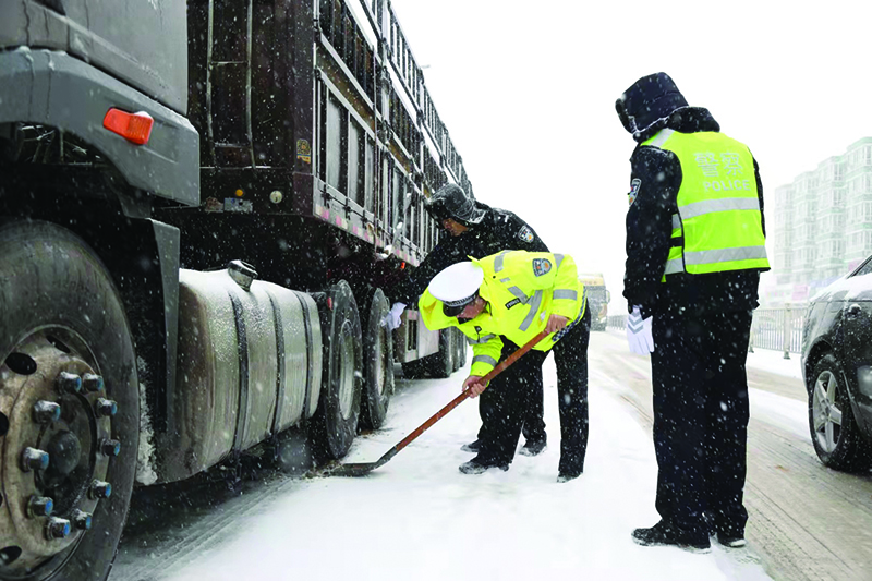 大雪寒潮袭击,道路积雪结冰,给群众的生产生活带来影响。省公安厅以雪为令,组织全省交警、巡特警等部门投入到巡逻防控、交通疏导和安全防范等各项工作中。民警们顶风冒雪,一步一滑地帮助群众解救受困车辆,深一脚浅一脚地走进积雪最深处,用自己的血肉之躯为百姓丈量积雪深度。