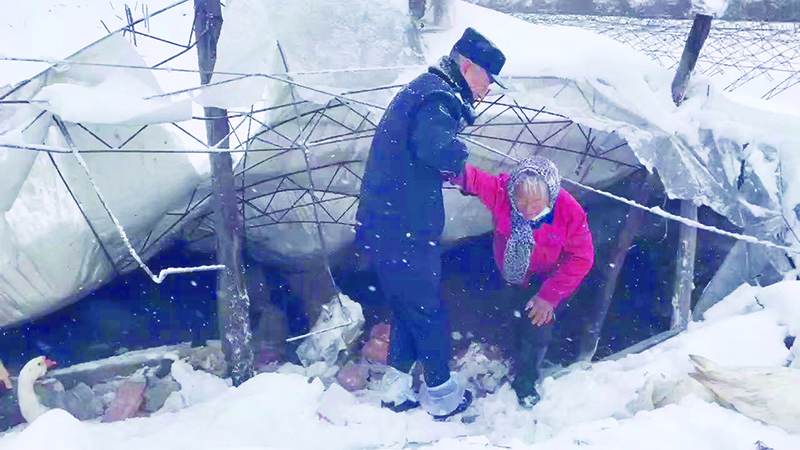 民警赶到现场后,只见坍塌的大棚已被皑皑白雪掩盖,大娘被困在其中。民警钻进大棚,用最快的速度把大娘搀扶出了大棚。