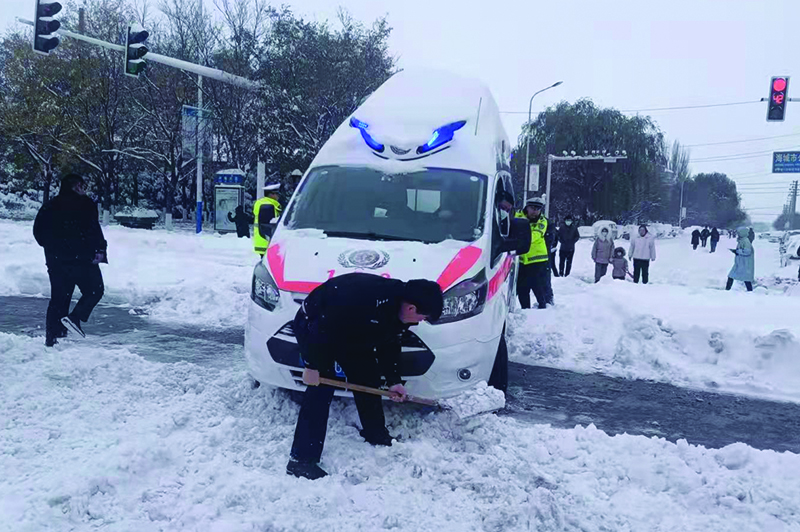 海城市公安局开发区派出所值班民警为被困救护车开路。