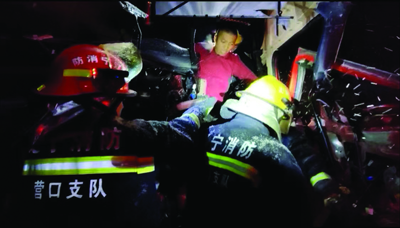 营口市消防救援支队接到报警后,立刻调派盖州大队清河大街消防救援站出动两辆消防车、8名指战员赶赴现场。当撑顶器将变形车门撑开,硕大的雪花在指战员帽灯的照耀下飘飘洒洒,似乎见证着救援现场的高效有序——3名指战员以迅雷般的速度分别从3个方向攀上驾驶室,一人护住被困司机头部,另两人分别从腿部锁定破险位置,此时,被困司机的双腿被变形的车身严重压伤,右腿伤口处血流不止,“一手把方向盘,一手搂我脖子!”指战员一边全力救援,一边与受伤驾驶员沟通,随着层层破拆,1分35秒,伤者成功脱险!