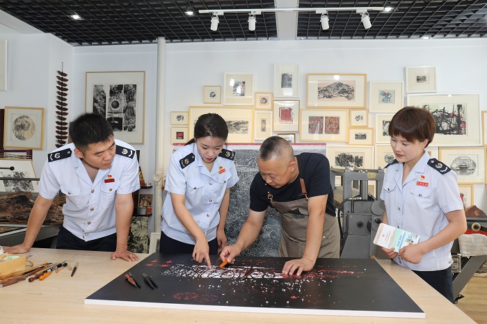 辽宁长安网讯 近日,辽宁省文化和旅游厅、辽宁省人力资源和社会保障厅、辽宁省乡村振兴局共同发布了辽宁省首批17家省级非遗工坊名单,桓仁传统版画的名字赫然在列。在非物质文化遗产保护与传承的道路上,桓仁满族自治县税务局落实落细税费支持政策,以税惠红利和贴心服务助推非遗文化焕发活力。图为税务干部走进辽宁东明工艺品有限公司创作画室,与公司负责人陈东明交流艺术创作历程,借助非遗传承的文化底蕴开展税收宣传活动。